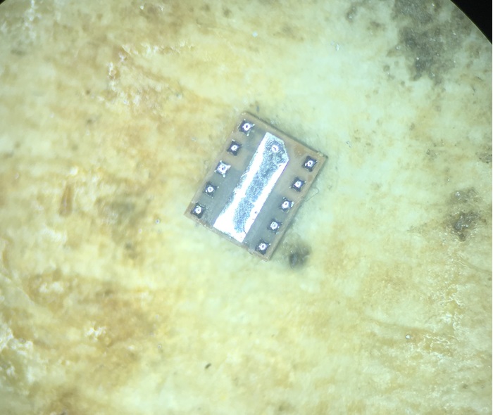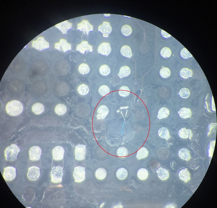А вот и то, почему я решил, что недогрел. оторвался один используемый пятак. В этом нет ничего страшного. Тут, как и в любой другой работе, косяки случаются и главное уметь их вовремя исправлять. Берем тоненький проводок, припаиваем его на место "пятака", а потом мажем синей "масочкой"