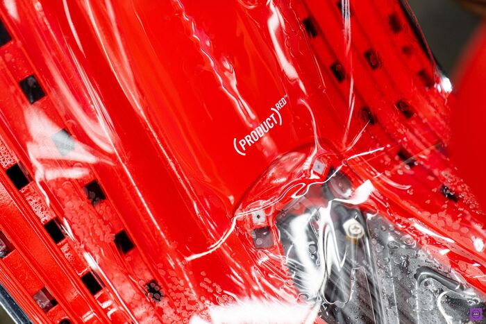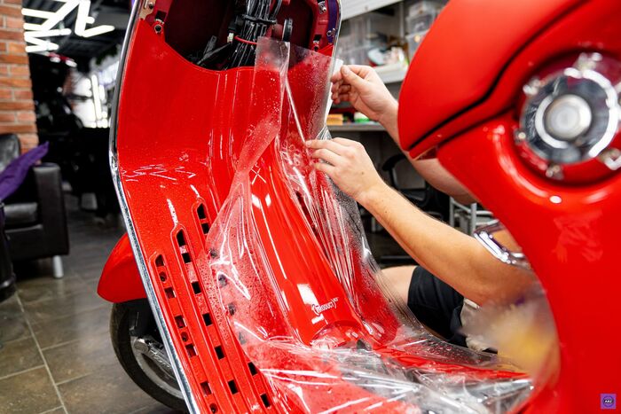 Работаем мы руками, а не отмазками, и когда перед тобой стоит Vespa цвета, способного вызвать ревность у самой Феррари, волей-неволей начинаешь работать аккуратнее. Плёнку подбирали глянцевую, как сама Vespa — зеркальная до такой степени, что забываешь, что это вообще не зеркало.