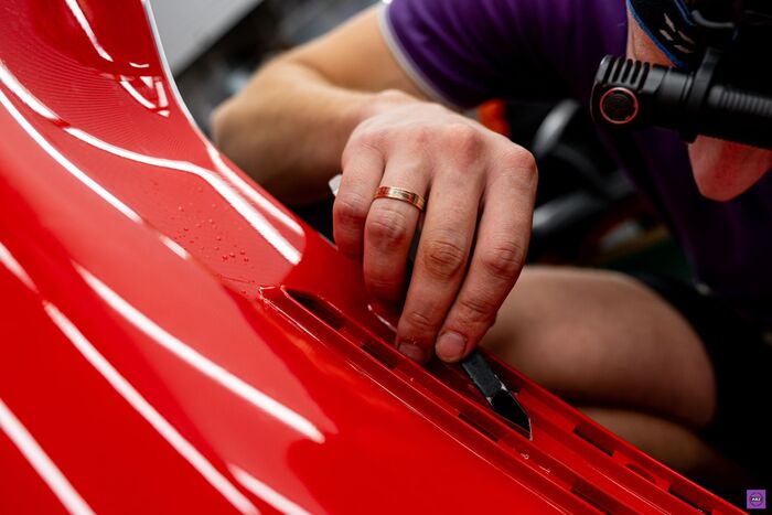 Клеили как на операционном столе: с подсветкой, лупами и чётким осознанием, что на красном фоне малейшая пылинка будет смотреться как предательство. В какой-то момент кто-то даже пошутил, что если бы Vespa была человеком, она бы сейчас закричала: «Только не в лицо!»