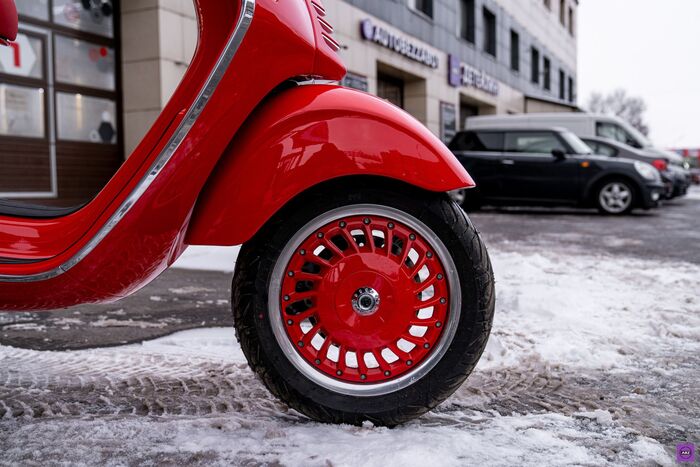 В общем, сделали на совесть, качественно и красиво. Настолько красиво, что когда выкатили скутер на улицу, снег отступил сам, возможно потому что на улице был март, а может потому что испугался испачкать блестящую девочку.