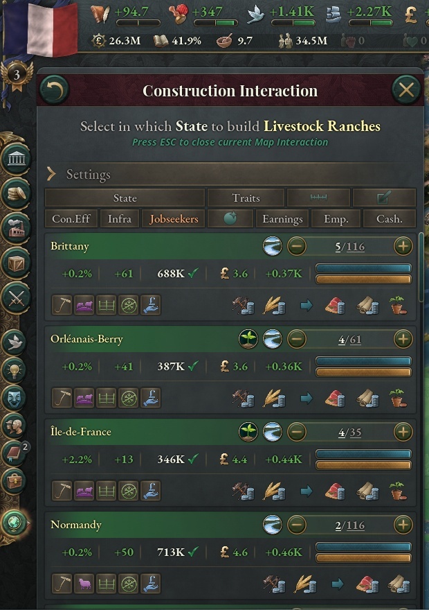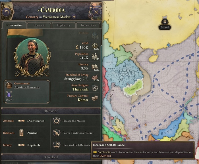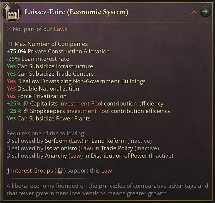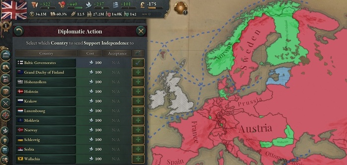 Например, лобби, поддерживающее целевую страну, облегчат ведение дипломатии с этой страной, повысив уровень согласия ИИ на предложения и снизив стоимость влияния любых дружественных пактов, которые вы с ней заключаете, но повысив стоимость враждебных действий (например, эмбарго) и снизив влияние, которое вы получаете от соперничества с ней. Ожидаемо, лобби против целевой страны дают противоположный эффект, делая дружественную дипломатию сложнее, а враждебные действия — дешевле. Лобби выступающие за независимость или за сотрудничество с сюзереном влияют на стремление к свободе, как уже упоминалось в предыдущем дневнике разработчиков.