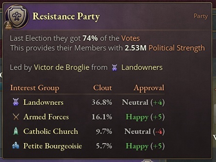 У лобби есть показатель умиротворения, который растёт при принятии действий, которые соответствуют целям лобби, и снижается при принятии действий, которые, по их мнению, противоречат их целям. Умиротворение — это нечто вроде модификатора одобрения заинтересованных групп, а это значит, что ваша внешняя политика теперь будет напрямую помогать или вредить вашим внутриполитическим целям.