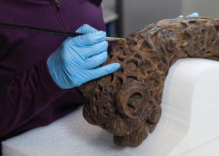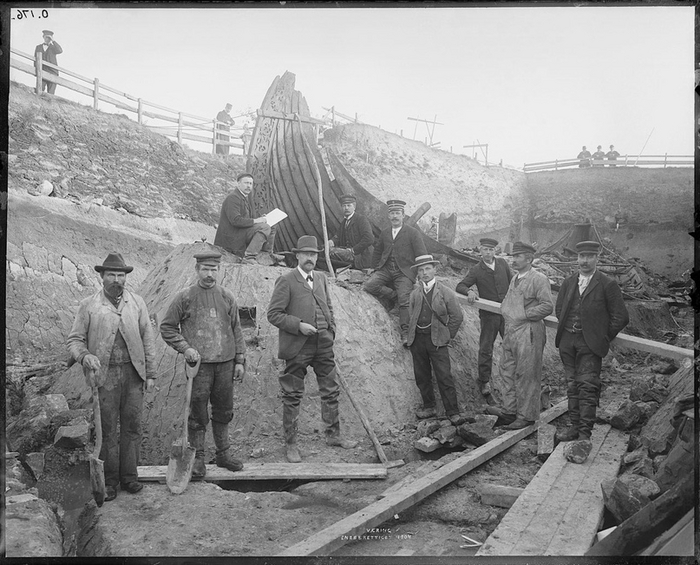 Лето 1880 года выдалось необычайно жарким для Норвегии, что облегчило работу в ходе раскопок, но не явно не пошло на пользу кораблю. Дерево стало высыхать, изгибаться и крошиться, в ходе работ его постоянно поливали водой и прикрывали ветками и брезентом, защищая от высыхания. Вскоре судно установили на опоры прямо в яме, подготовив его к транспортировке.