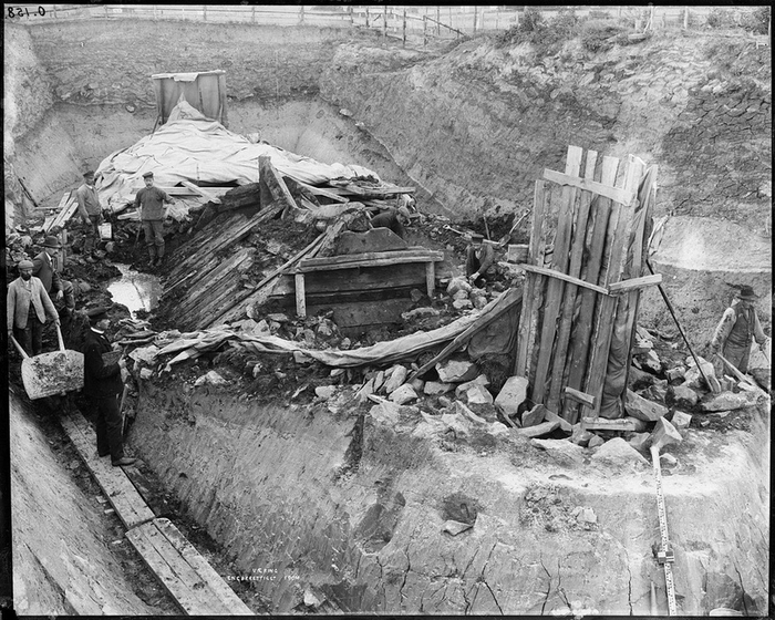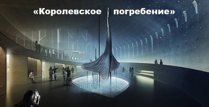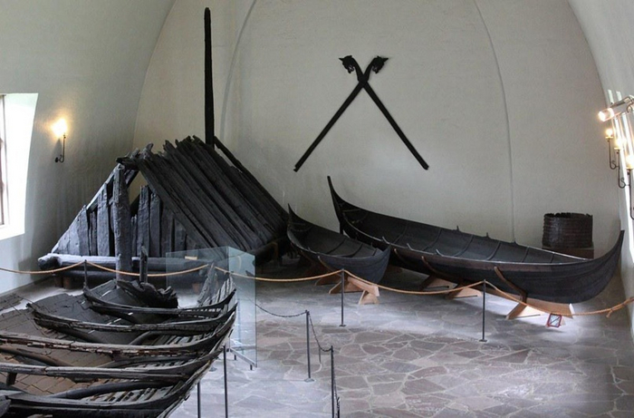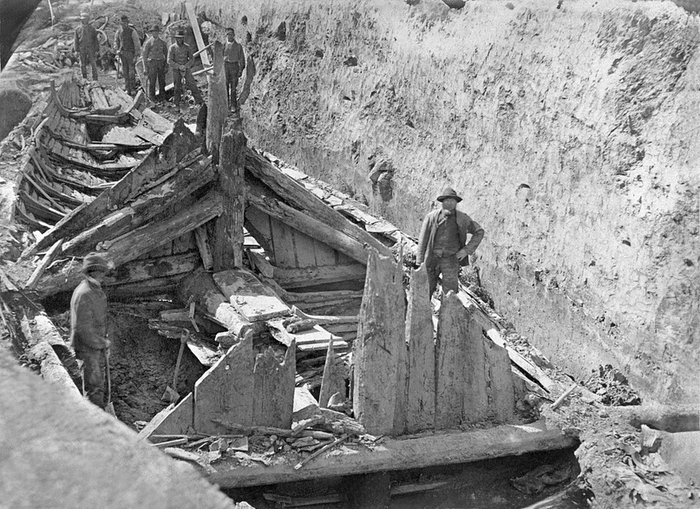 Фото погребальной камеры и трех лодок из погребения в Гокстаде