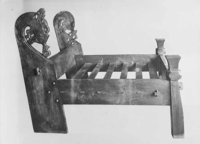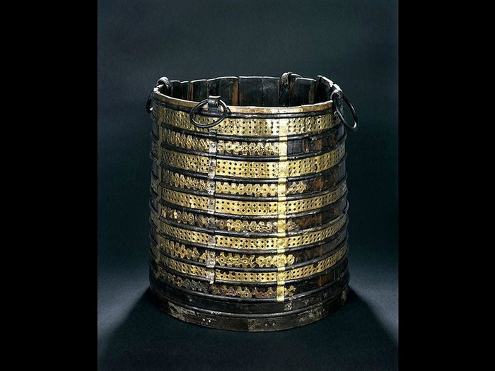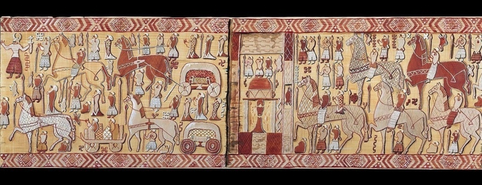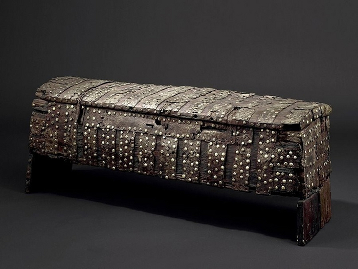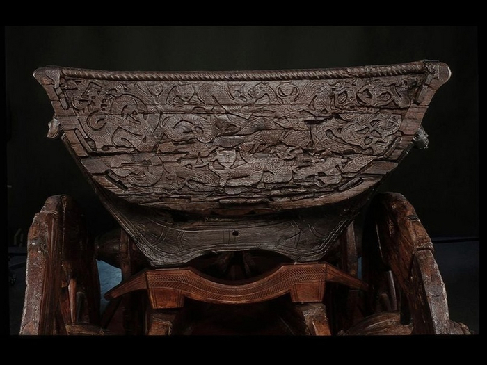 Погребальная камера в форме деревянного сруба с наклонной крышей находилась ближе к корме корабля и снаружи покрыта несколькими слоями бересты, изнутри ее обшили шелковыми тканями с золотыми нитями.