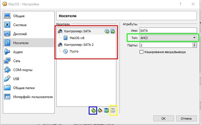 Самое интересное на этом шаге! Обязательно удалите виртуальный сидиром (кнопка обведена желтым), Добавьте новый SATA контроллер (кнопка обведена синим), тип обязательно AHCI у обоих контроллеров, после чего создаете новый виртуальный привод уже в новом контроллере (синяя дискетка с плюсиком). Кеширование отмечать не надо! К виртуальному приводу присоединяете образ скачанной вами MacOS.