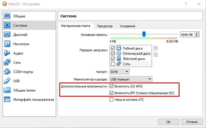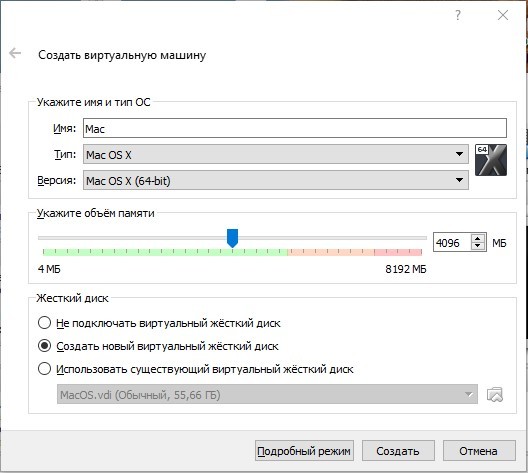 Указываем что хотим именно MacOS X, притом 64-битную, оперативы рекомендую выставить 4096 метров, но если у кого столько нет - и 2 гигов в принципе хватит.