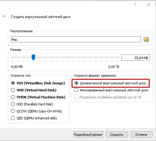 На следующем шаге вы создаете жесткий диск - выбирайте параметры как на скриншоте, диск оставьте динамическим - так образ ЖД займет меньше места на вашем компьютере.