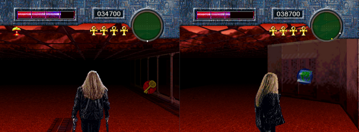 Не скажу, что игра трудна (особенно на эмуляторе с подключенным геймпадом), а сложность, по моим наблюдениям, поднимается за счет увеличения количества врагов, появления турелей и более опасных тварей. Но и совсем простой я её тоже не назову, это явно не казуальные пострелушки. Сами уровни представляют из себя либо относительно большие и просторные карты, на которых бесконечно спаунятся враги (в разумных количествах, что не сильно раздражает), либо узкие туннели (как правило, в каких-то пещерах) с небольшим количеством ответвлений и просторных комнат. Но встречаются и достаточно запутанные уровни (вроде такого), в которых даже с картой можно заблудиться, а без неё так вообще ужас! Кстати о ней, прежде чем воспользоваться картой, вам предстоит найти её, а до тех пор придётся самостоятельно запоминать расположение комнат и полагаться на радар. Правда бывают уровни, где даже его изначально нет, поэтому, как и карту, радар придётся ещё отыскать! Радует, что он обычно расположен где-то рядом со стартовой зоной.