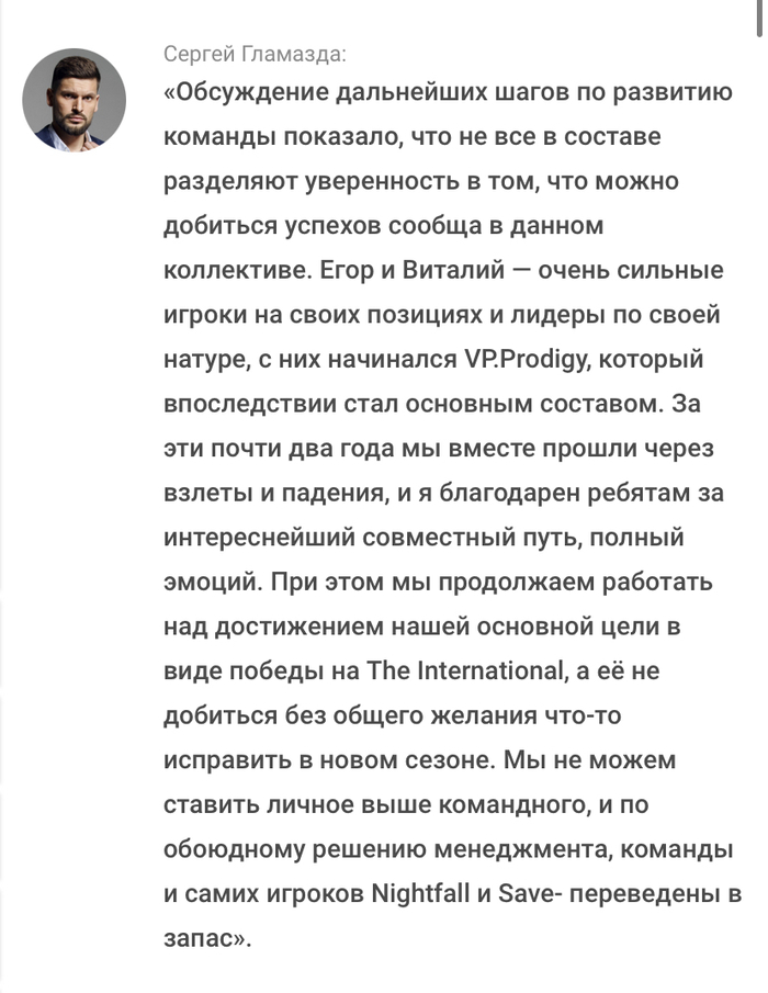 Наш CEO Сергей Гламазда, многие наши игроки и сотрудники имеют украинское гражданство. И несмотря на колоссальные моральные переживания, они хотят сохранить хотя бы надежду на мир, а потому не поддаются на многочисленные провокации и оскорбления со стороны отдельных представителей киберспортивного комьюнити. Это единственно возможное адекватное поведение в сегодняшнее тяжёлое время, когда любая зажжённая спичка может быть воспринята, как поджог целого леса. И для нас очень важна поддержка болельщиков Virtus.pro, которые понимают и разделяют позицию клуба.