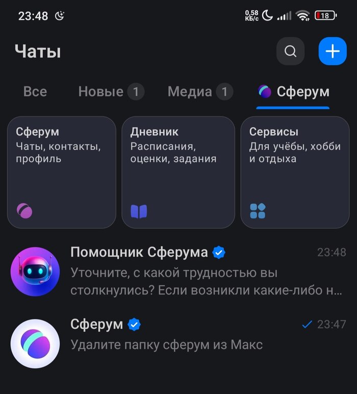 Я установил приложение Макс. В нем изначально присутствует папка СФЕРУМ. Но я им не пользуюсь, приложение удалено, так как ребенок закончил школу. На мои вопросы в поддержку я получаю только отписки. Скриншоты приложу в комментариях. При этом у других людей такой папки изначально нет. Как мне удалить эту папку и вообще, как достучаться до поддержки, если там сообщают о том, что у них писем от пользователей, как у Деда мороза?