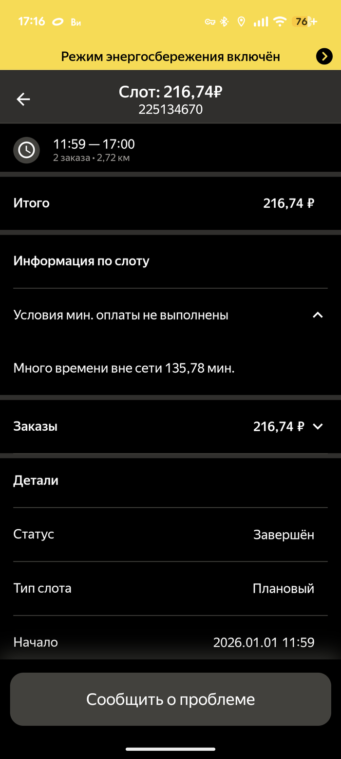 Недолго думая, взял смены на все эти три дня, и всё бы было хорошо, если бы не 1 января. Первого числа исправно выхожу на смену и вовремя открываюсь. Заказов практически нет. Через час падает два заказа; я их исправно доставляю. Продолжаю ждать. В итоге, спустя три часа, выходит время моей смены, и слот автоматически закрывается. Хочу сделать упор на то, что такое количество заказов было доставлено не по моей вине, а в силу объективных причин. Подчеркиваю: я не отказывался от заказов, не выключал интернет и геолокацию, делал всё по правилам Яндекса.