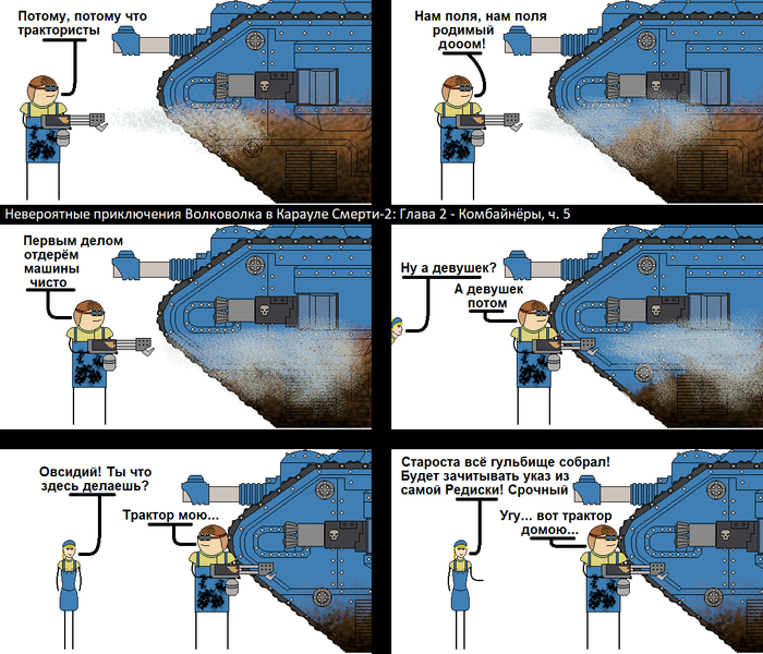 Глава 2 - Комбайнёры (начало) Подготовка планеты к обороне от вторжения флота-улья тиранид в самом разгаре. Брат Железный Рук пришёл в местный анклав Механикус, чтобы произвести оценку состояния сельскохозяйственной техники и возможность её переоборудования для нужд СПО
