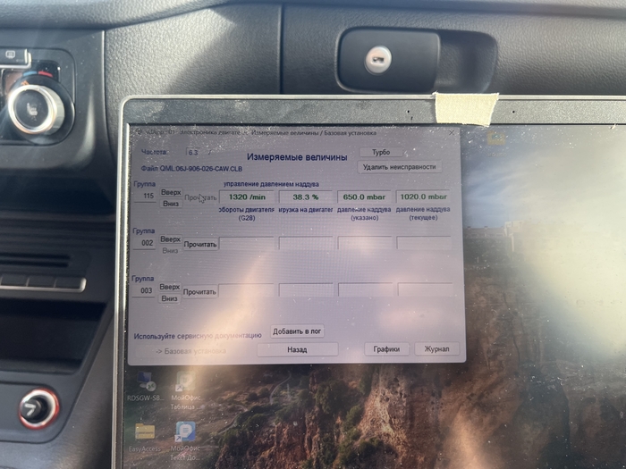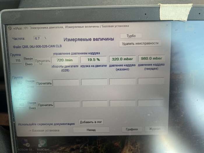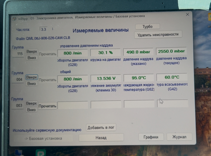 Нас интересует давление наддува (указано) и давление наддува (текущее). Объясняю: давление наддува (указано) - это то давление, которое запрашивает блок управления двигателя. Давление наддува (текущее) - это то давление, которое сейчас выдает турбина. Есть нюанс. Двигатель работает на холостом ходу, а показывает 2.5 бара - такого быть не может.