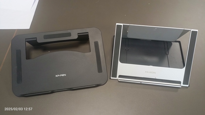 И...Пластиковая подставка с одним положением от XpPen или тяжелая алюминиевая от Huion, имеющая ДВА отдельных упора, что дает просто огромную массу возможных углов. Мне лично больше понравилась пластиковая. Просто потому что она не стремится при любом маневре на столе тут же сложится к хренам с треском и звоном. В общем, что-то тут Huion наворотили непонятного.
