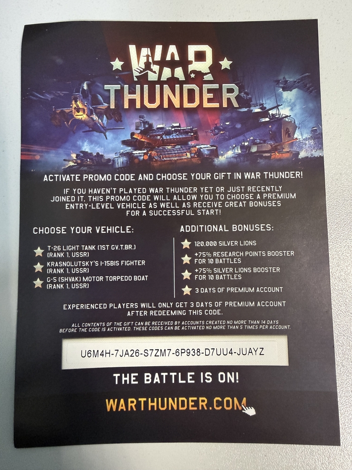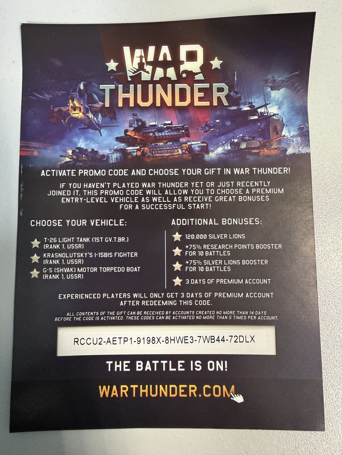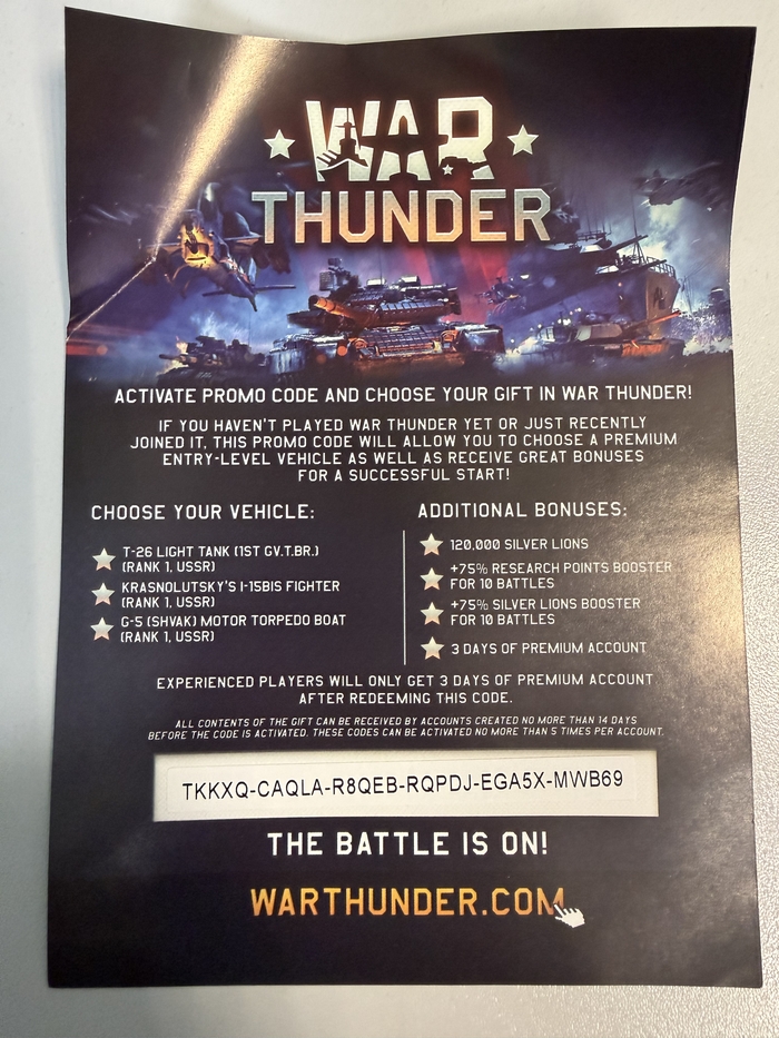 Промокод на бонусы в War Thunder