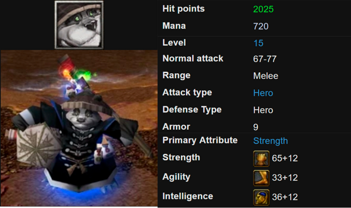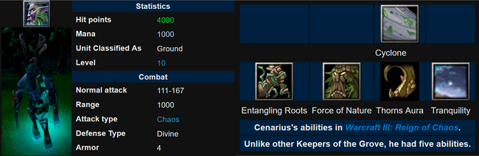 Немыслимо завышенные характеристики, которые, скорее всего, нарушают целостность игры. Намного сильнее Архимонда и Кенариуса, но первый может выиграть, прикрываясь вызываемыми юнитами. Кенариус у него тоже может выиграть, используя entangling roots (но по правилам это не является честной победой).