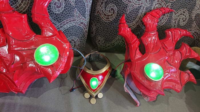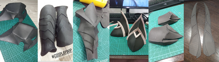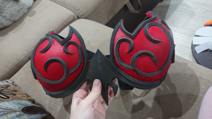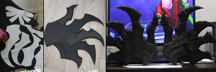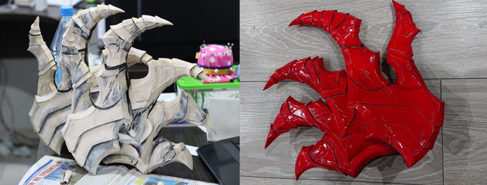 Далее соединяем их при помощи клея, при необходимости подпиливая стыки и края с помощью гравера. За основной референс я взяла наплечники Валиры из игры Heroes of the Storm. Детализация на них такова, что вся видимая поверхность составляет смешение разноуровневых выступов и канавок. Чтобы получить такую фактуру, я нарезала много полос разной ширины из ева пены 3мм. Так же чтобы увеличить разницу высоты уровней, я с помощью гравера плавно убрала толщину полосок евы с одного края, доведя до минимального значения, при котором полоска оставалась целой. Далее я обклеивала этими полосками основную форму, стараясь подражать детализации оригинала, после чего был добавлен боевой урон.
