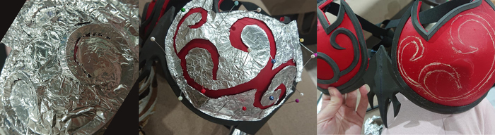 · На одной части доспеха делаем узор, какой нам нужен. Далее обматываем эту часть фольгой и продавливаем на ней выпуклые узоры.