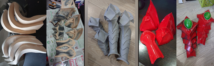 Необычная форма деталей на локтях и коленях заставила повозиться над выкройками, но через какое то время у меня все таки получились близкие к оригиналу детали. Большую схожесть с оригиналом им придала формовка строительным феном.