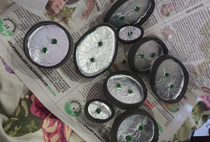 С обратной стороны камни затонированы акриловой краской для большей насыщенности цвета и закрыты пищевой фольгой для лучшего рассеивания света. При добавлении фольги к таким камням располагайте ее так, чтобы она не касалась диода и проводов, тк от прикосновения их коротит. :’-D