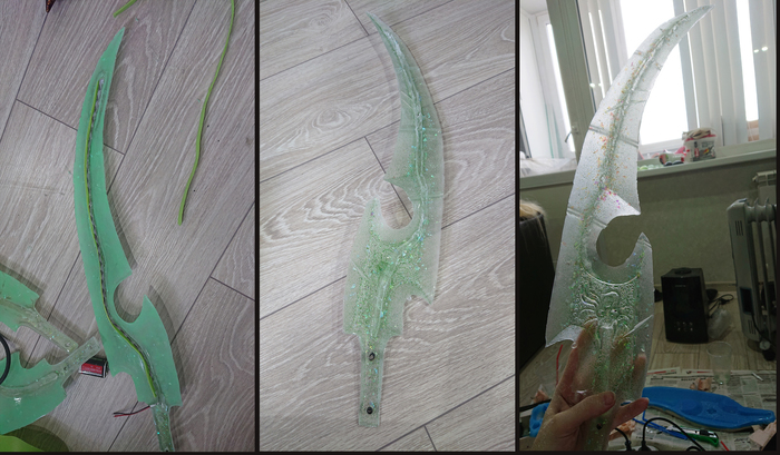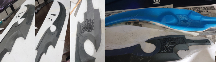 По похожей схеме создавались и сами клинки. Я планировала использовать подсветку, поэтому решила сделать лезвие из двух половинок, чтобы в последствие аккуратно разместить внутри диодную ленту.