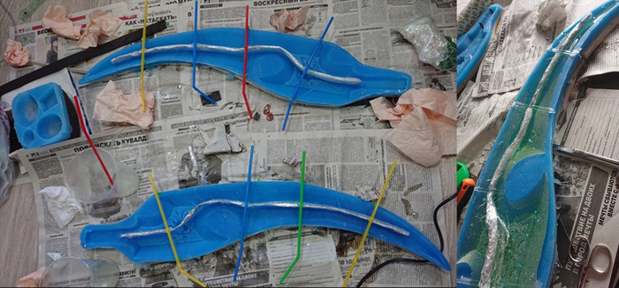 Для наших целей нужна была полость внутри клинка, поэтому из фольги, которую затем обернула пищевой пленкой, я сделала продолговатые детали и разместила их внутри молда перед заливкой. Эта деталь закреплялась на трубочках, лежащих поперек молда, таким образом получилось, что эта деталь не лежит на дне, а как бы парит над гранями клинка. Прилаю фото, надеюсь, с ними будет понятнее.
