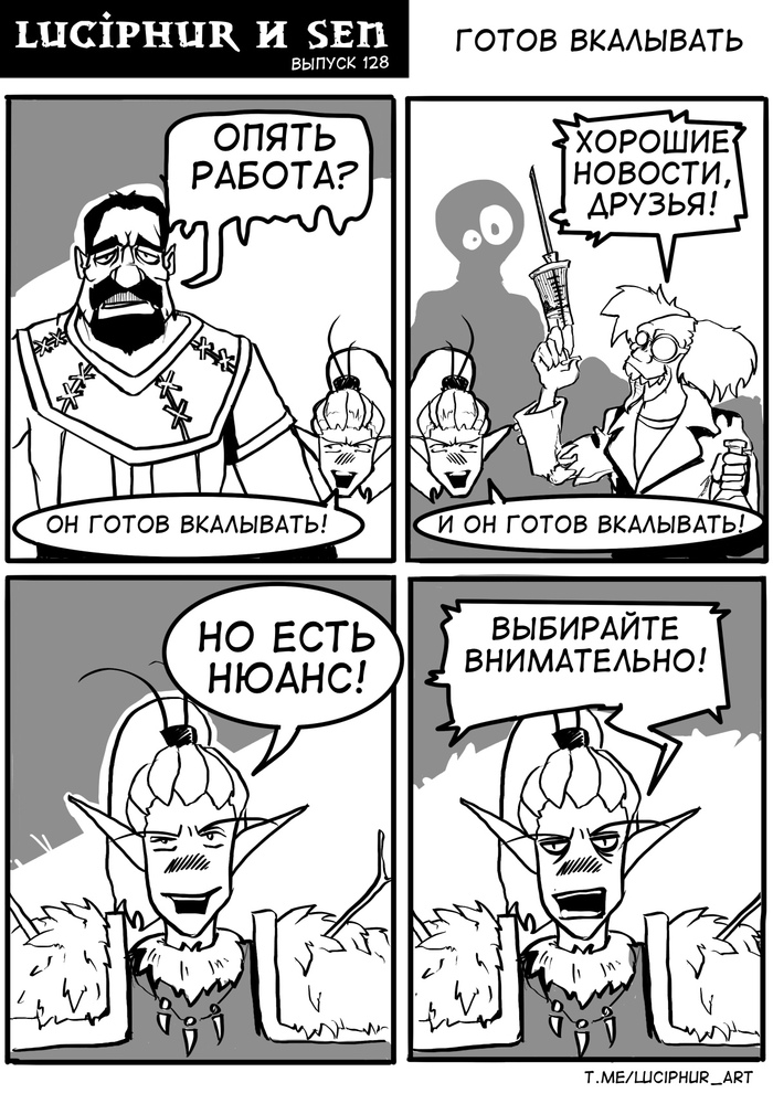 «Готов вкалывать» - одна из типичных фраз рабочих в Варкрафт 3, вместе с «Опять работа?» и прочими крылатыми выражениями радости от постоянной занятости. Недавно наткнулся на стикер с рабочим в моем стикерпаке и в голове засела идея пристроить его в максимально недовольном виде в очередной комикс.