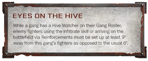 Пока в составе банды есть Смотритель Улья, бойцы противника, использующие навык Инфильтрация или прибывающие на поле боя с помощью подкрепления, должны находиться на расстоянии не менее 9 дюймов от бойцов этой банды, а не на обычных 6 дюймов.