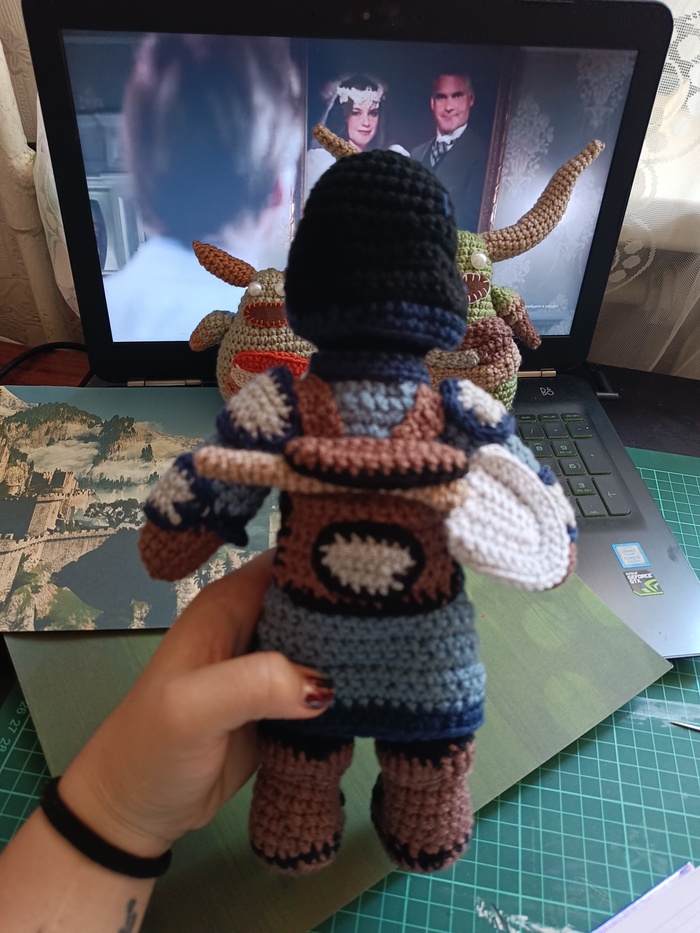 Черной нитью из основания стопы провязываем за оставленные передние петли в 6 ряду 36 сбн, замыкаем кольцо сс, нить обрезаем и убираем.