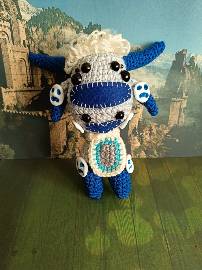 Бежевой нитью начиная с 15 и до места присоединения синего цвета за каждую полупетлю - 1 сбн, нить обрезаем и убираем.