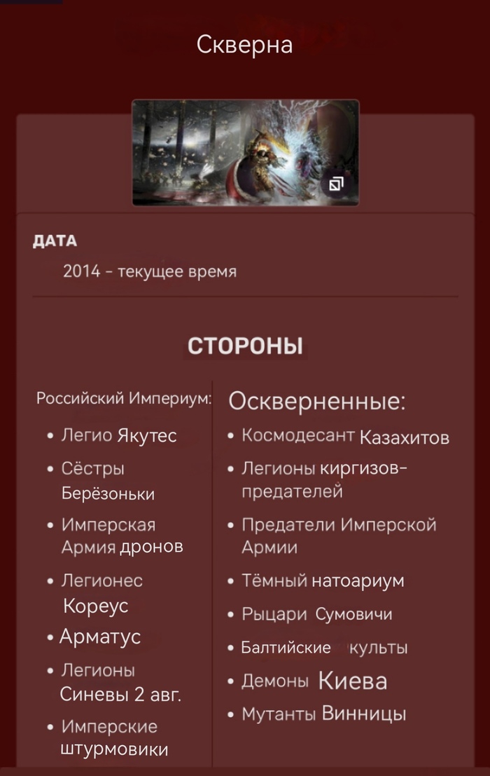 Защита исторических и культурных связей: Империя человечества в Вархаммер 40к характеризуется сильными историческими и культурными связями с другими планетами и системами. Аналогично, Россия имеет сильные исторические и культурные связи с Украиной и другими странами Восточной Европы, и защищает эти связи от внешних влияний и угроз.