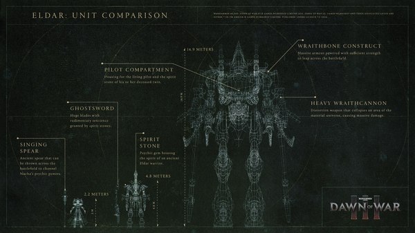 На официальном сайте Dawn of War были презентованы схемы с описанием и ростовкой эльдар. Честно скажу, вполне себе адекватная схема с нормальными цифрами, в отличии от схемы космодесанта.