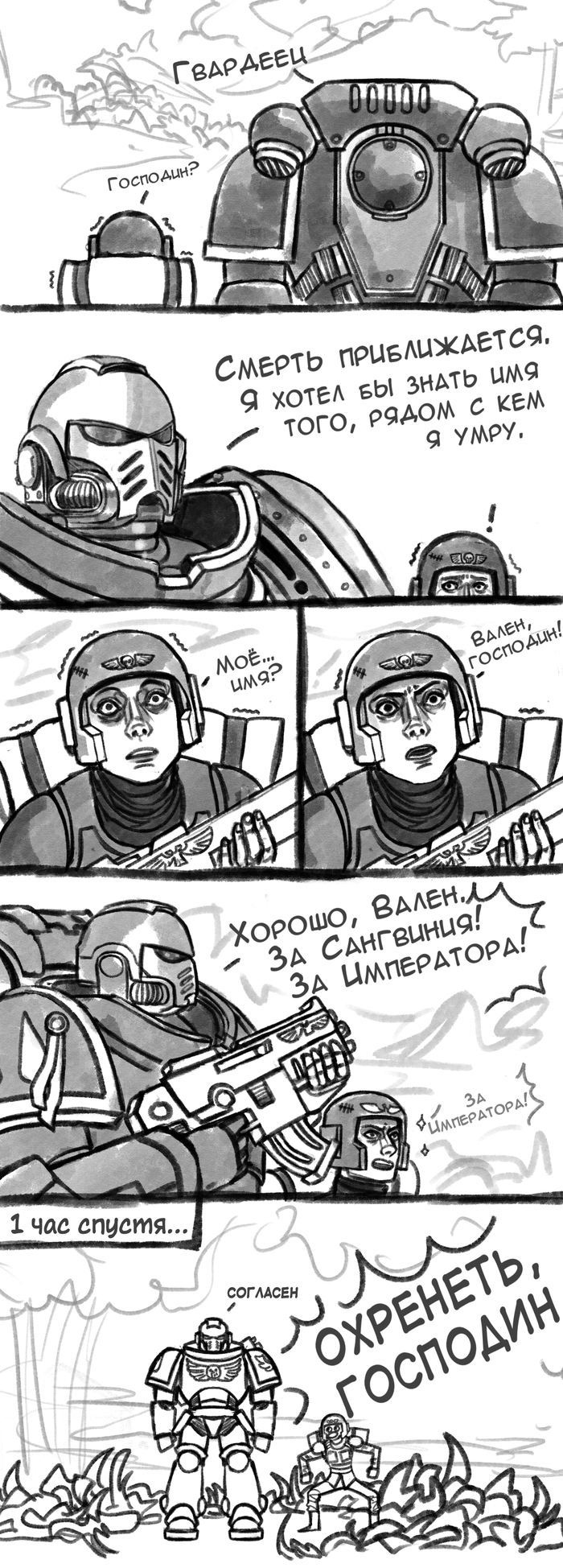 Комментарий автора CardEnvironmental271: Глупый комикс о шутке, которую я услышал в Space Marine 2 и расчувствовался по этому поводу. (Не обращайте внимания, что космодесантник - Кровавый Ангел, а не Ультрамарин, я был в режиме покраски миниатюр и очень сосредоточен на сыне Сангвиния в этот момент.)