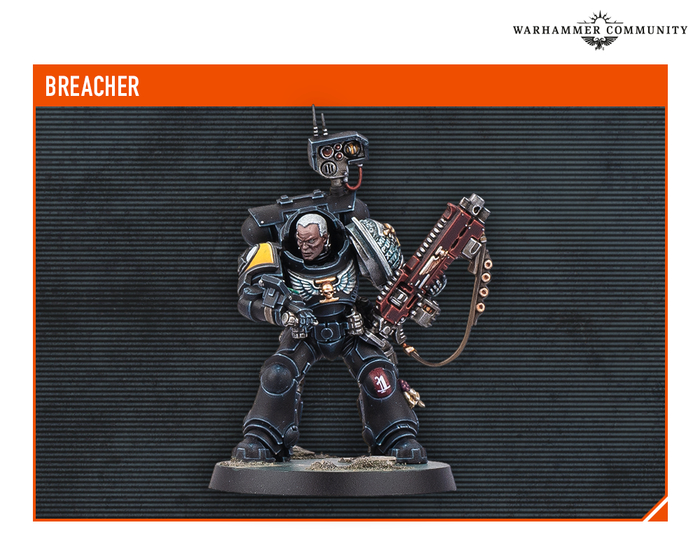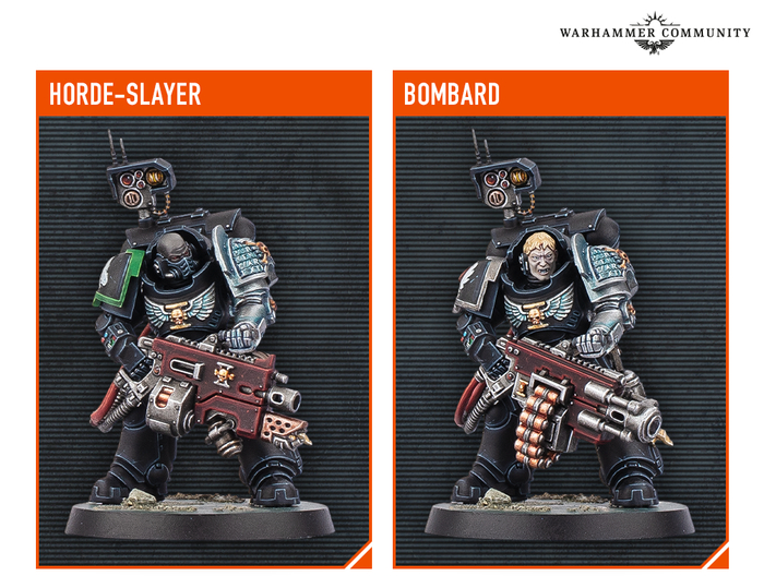 Последний, но не по значению, боец в броне модели "Гравис". Имеет три варианта. Убийца Орд с тяжелым болтером модели "Инфернус". Бомбардир с осколочной пушкой. Бричер с болт-винтовкой "Адский шторм" для уничтожения множественных целей, а для тяжелобронированных противников у него есть мельта-бомбы.