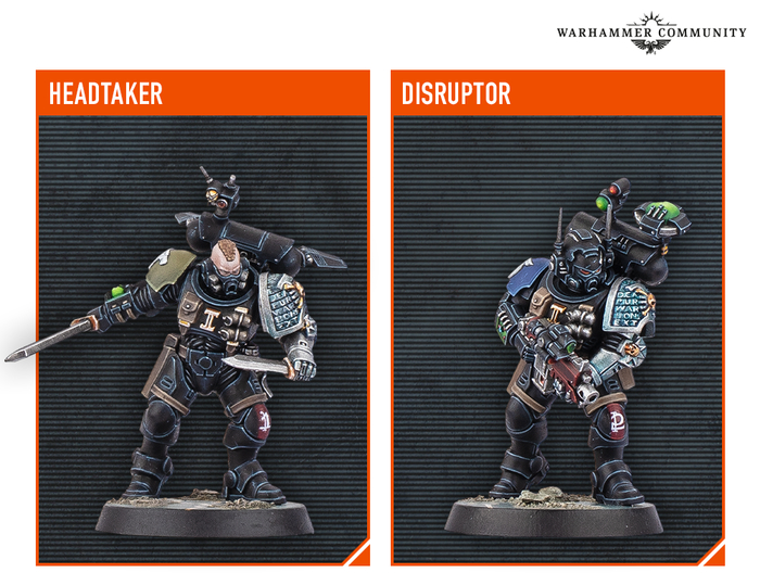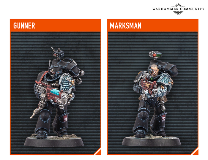 Заканчиваем с теми кто носит броню "Тактикус" и переходим к броне модели "Фобос". Так же две модели на выбор. Первый — Головорез — оснащен гравишутом, боевыми ножами астартес, крюком как у Риверов. Второй — Дисраптор — более скрытный, вооружен карабином и усовершенствованным омни-скрэмблером.