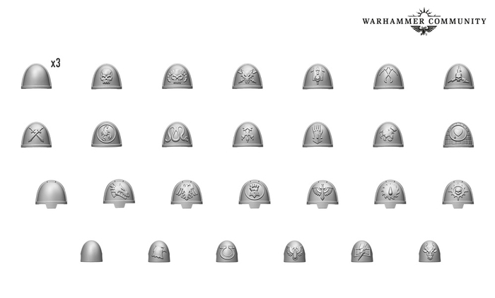Для десантников в "Тактикусе" — эмблемы Медных Черепов, Экзорцистов, Волчьих Копий, Копий Императора, Кос Императора, Повелителей Бурь, Кровавых Рыцарей, Красных Скорпионов, Железных Змей, Черных Когтей, Железных Рук, Медных Когтей и Плакальщиков.