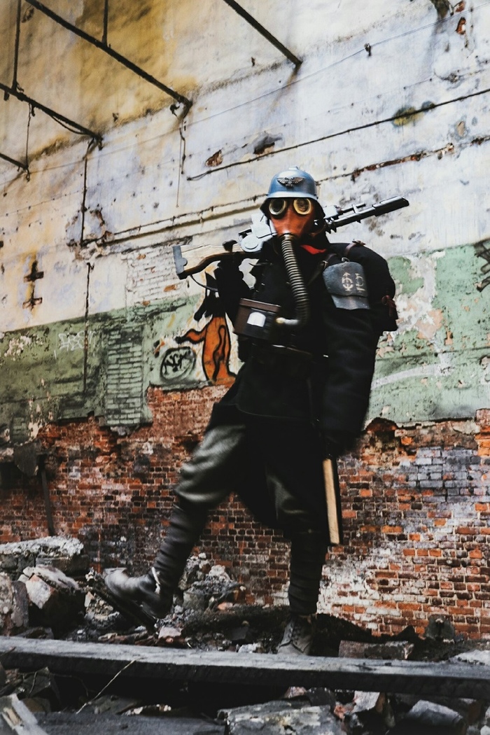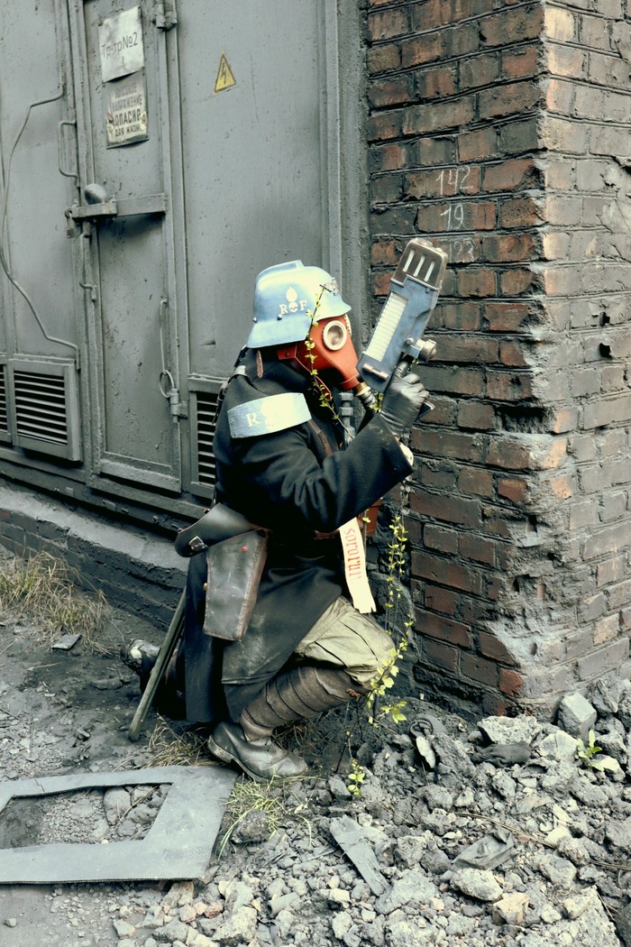 Противогаз - детали от советского ГП-5, переставленные на формованную кожаную маску. «Хобот» подключается к обтянутой кожей коробке из фанеры.