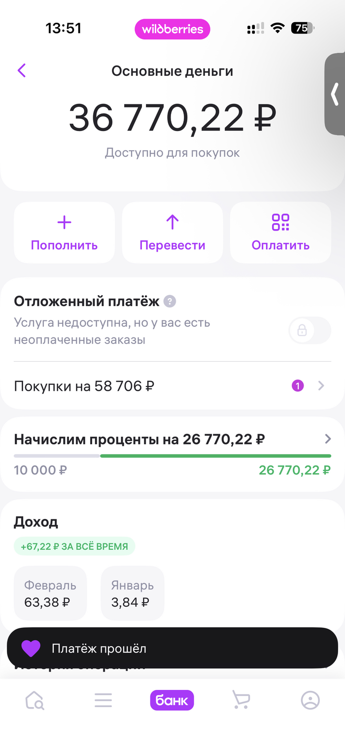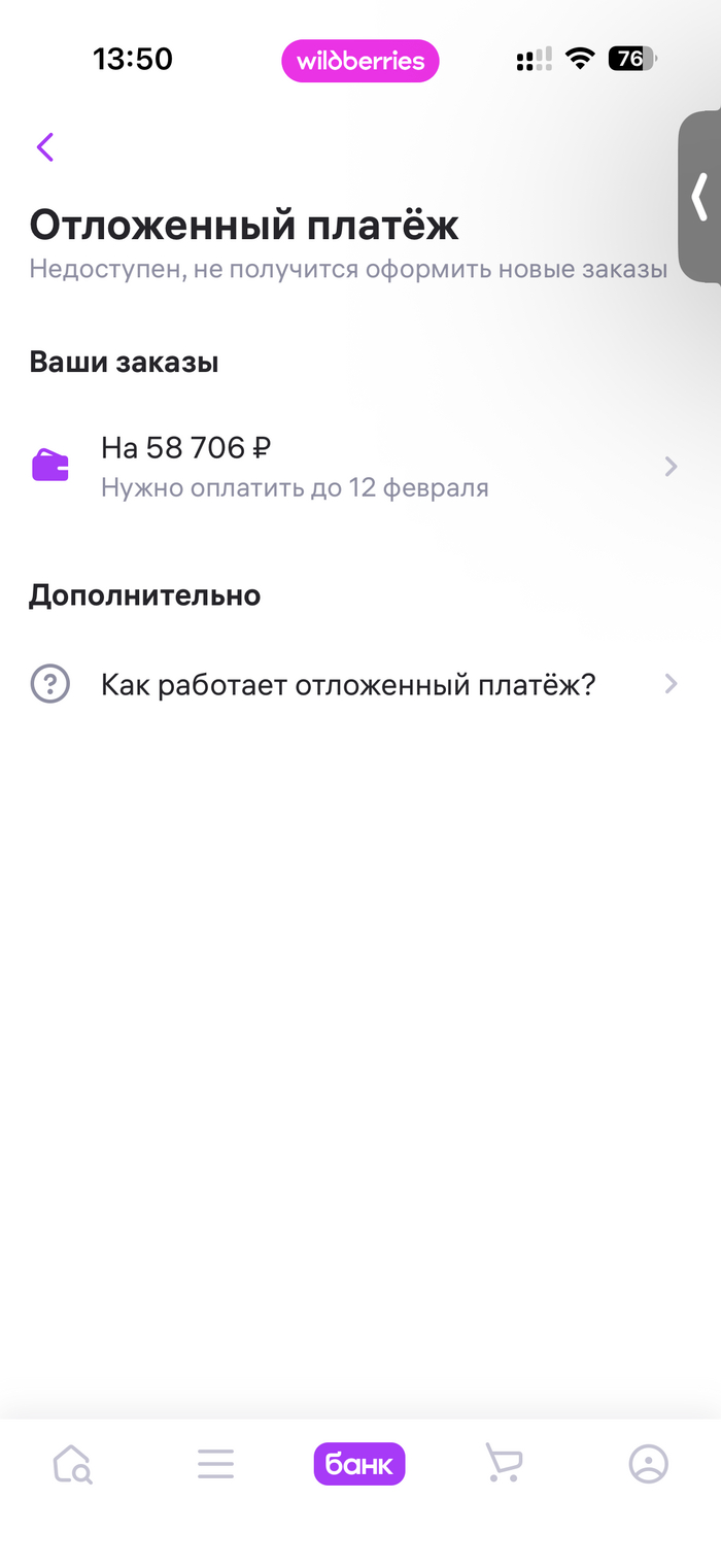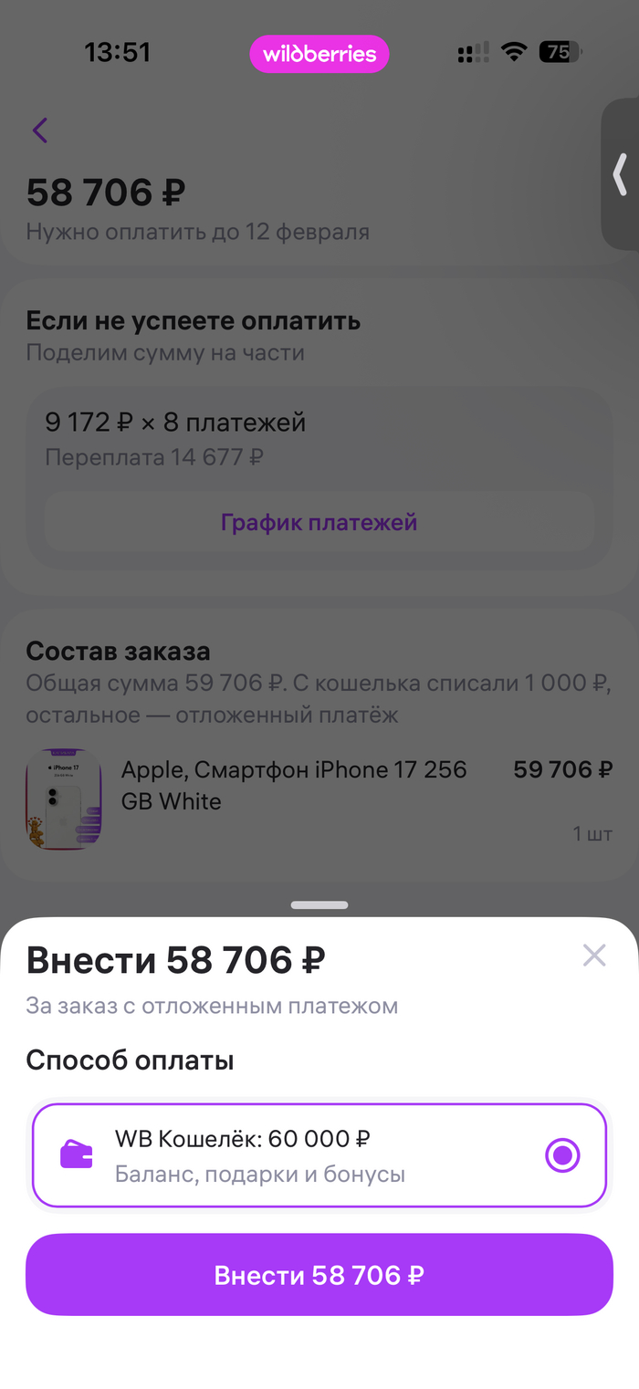 По условиям отсрочки платежа, товар нужно оплатить в течение 14 дней, если оплаты не будет, автоматически начнется рассрочка платежа с переплатой. В течение нескольких дней пополнил кошелек WB на сумму, достаточную для полного погашения платежа. Однако при попытке оплаты в приложении WB, ничего не произошло, т.е. деньги остались в кошельке, а оплата не прошла. Хотя в приложении было уведомление "Платеж прошел". То же самое происходило при попытке оплаты на web сайте. В течение 10-12 дней до 12 февраля 2026 года многократно пытался произвести оплату, но не получилось.