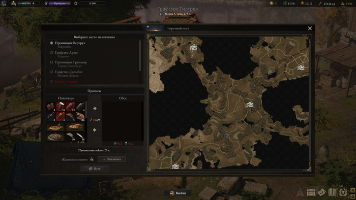 В каждом регионе, в основном городе, теперь можно создать Торговый пост, где можно сложить предметы и оставить бойцов. Стоить это будет от 500 до 1500 монет, и после создания, можно между ними путешествовать, но я, честно говоря, не пользуюсь- надо положить еды на время путешествия, а если вы пытаетесь торговать, то за быстрое путешествие с вас возьмут налог за торговые товары.