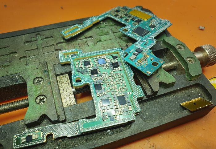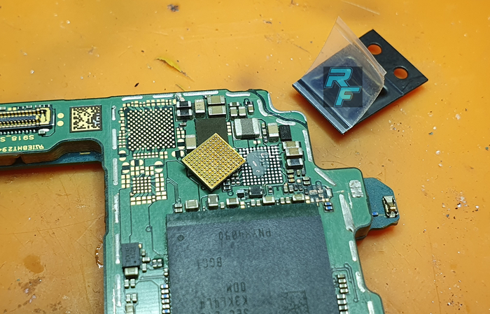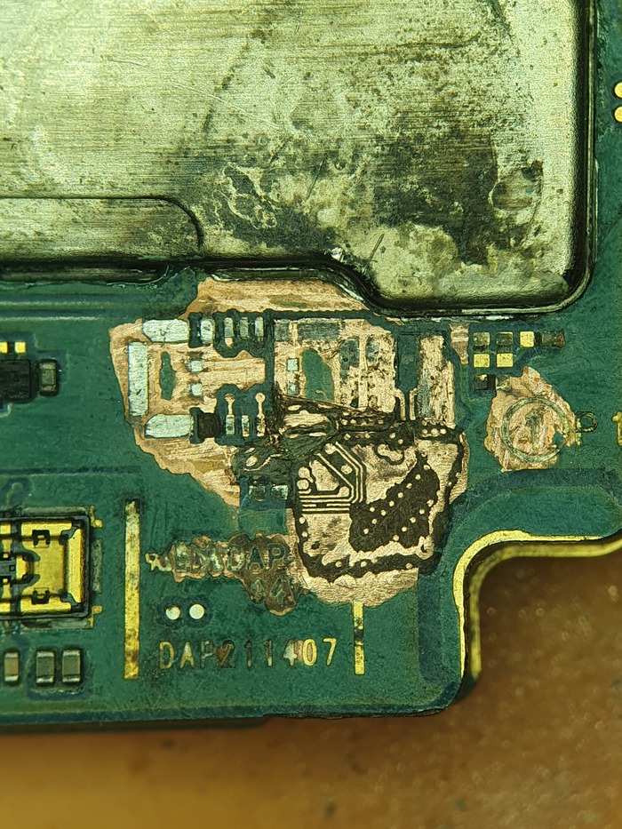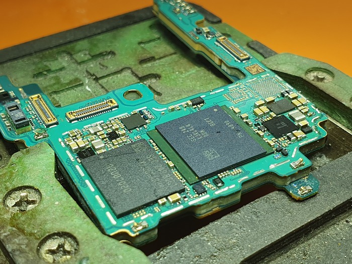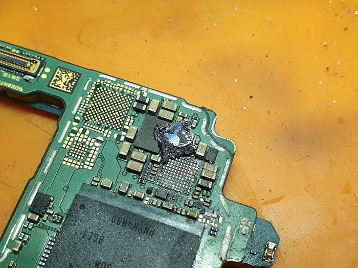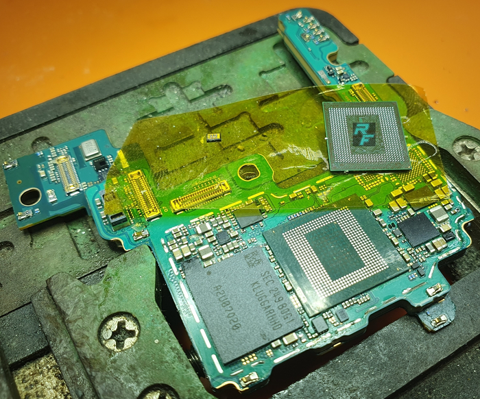 И уже снова из под низа жарю доску и снимаю процессор и чип arb (шифровка knox или secureNVM. При начальной заставке на телефонах Samsung наверняка видели это "Secured by Knox").