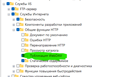 3. Разворачиваем узел Internet Information Services, затем World Wide Web Services, и Common HTTP Features. Ну или просто ищем Публикация WebDAV