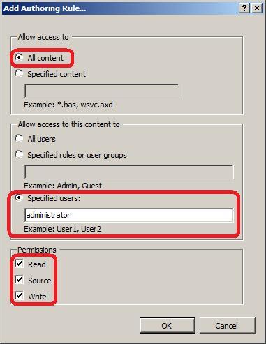 4. После включения WebDAV, создадим правила доступа к содержимому, нажав кнопку Add Authoring Rule.