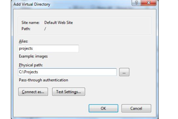 Укажите алиас (имя виртуального каталога IIS) и путь к папке, к которой необходимо открыть доступ и нажмите OK.