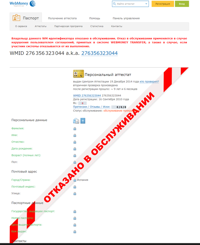 Здравствуйте! В соответствии с положениями пунктов 9.3. и 9.5. "Соглашения о трансферте имущественных прав цифровыми титульными знаками" http://www.webmoney.ru/rus/legal/transfert.shtml, мы прекращаем обслуживание вашего идентификатора 276356323XXX в системе WebMoney Transfer.