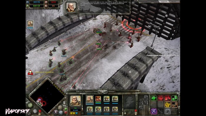 Вступительный ролик знакомит нас с генералом Стурном и его товарищем комиссаром. А также мощью имперской авиации, которая в дальнейшем сыграет не последнюю роль! Собственно, первым же нашим заданием является наклепать как можно больше гвардейцев и проломить ворота, которые еретики (они же хаоситские подстилки) так рьяно защищают.