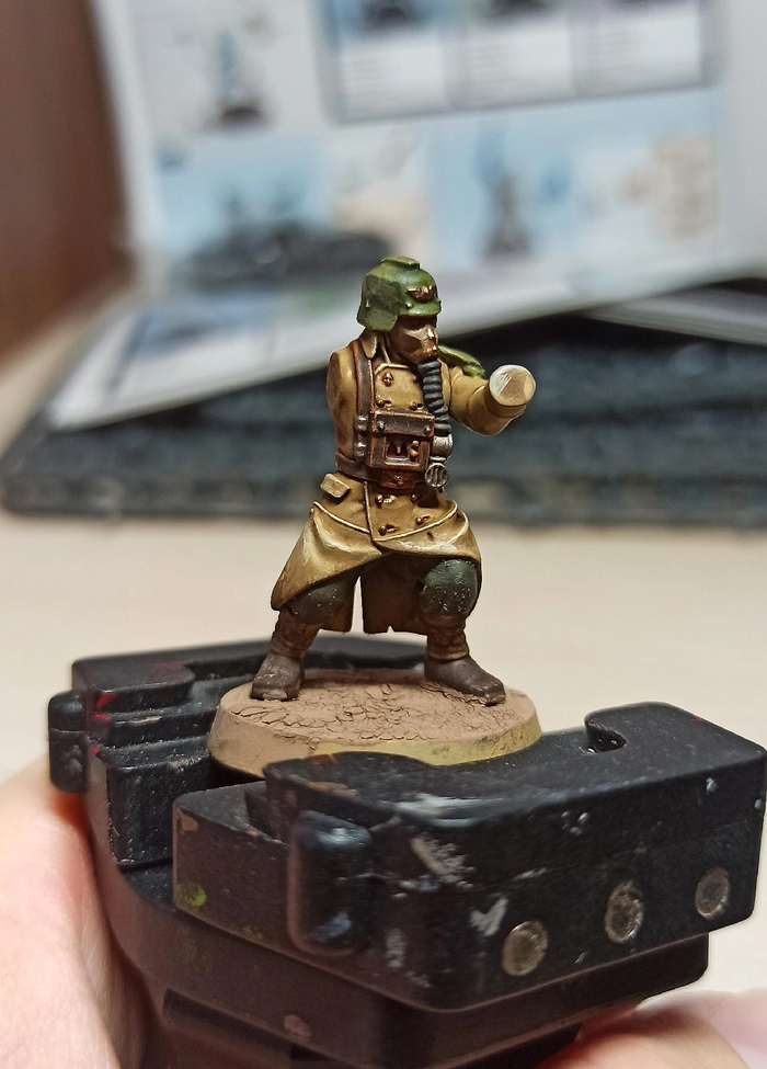 После грунтовки в несколько слоёв, я приступил к нанесению базовых цветов. Сверху, как и писал ранее, это была охра. Точнее vallejo 70.856 ochre brown. Снизу vallejo 72.102 steel gray