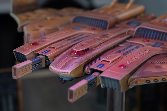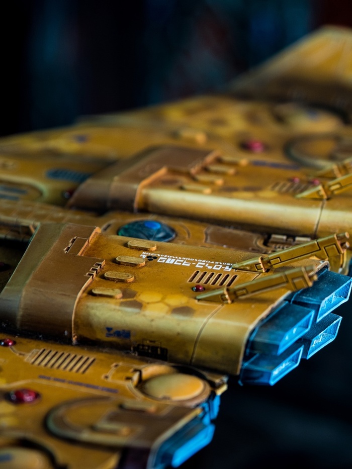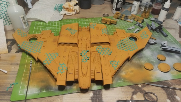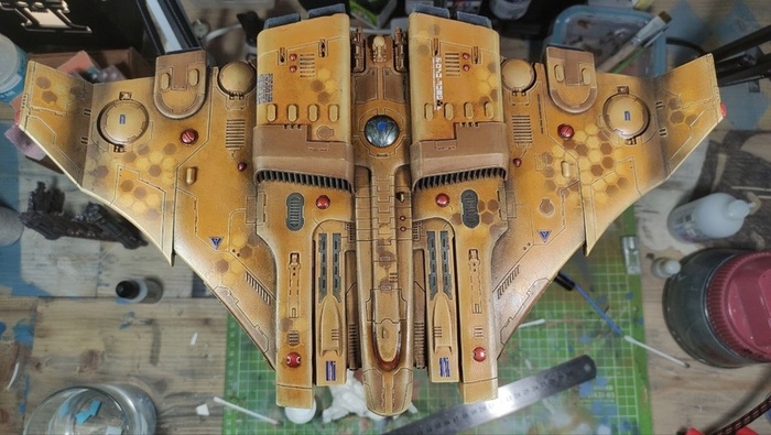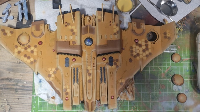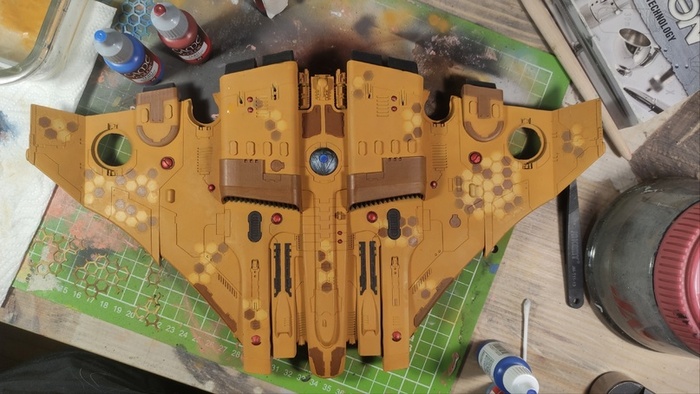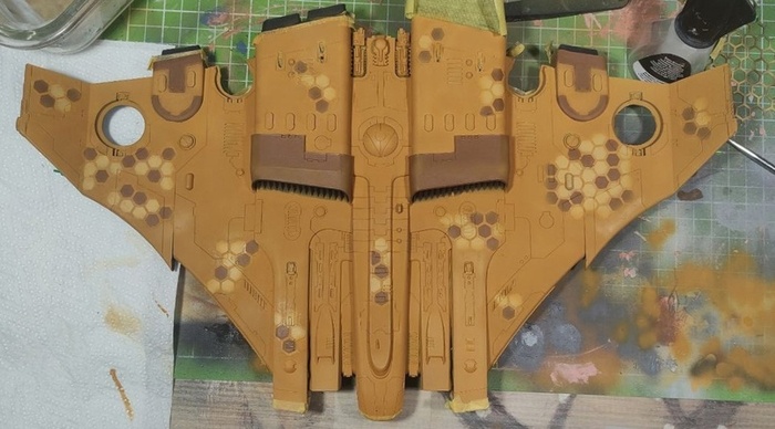 В итоге, верх модели был сделан охряным, с вкраплениями гексагонального камуфляжа, что должно маскировать самолет на фоне песчаных и засушливых пейзажей миров-ульев или же загрязненной атмосферы