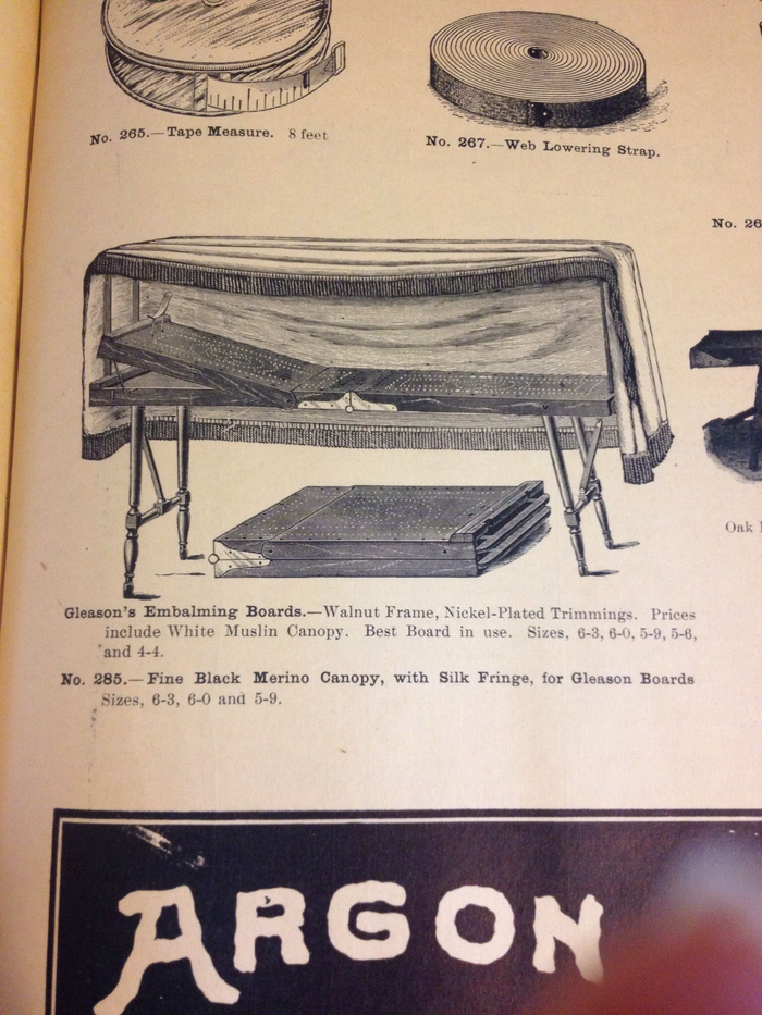 Это охладительный стол. В викторианскую эпоху похороны проводились дома у умершего. Если человек умирал неожиданно (если он болел или была травма, подготовиться можно было заранее), то необходимо было сохранить тело достаточно долго. Эти охладительные столы устанавливались сверху нескольких больших блоков льда. Холодный воздух от льда проникал через отверстия в столе и сохранял тело (действительно хорошо). Столы также использовались для процедуры бальзамирования, так как отверстия служили для отвода жидкостей.