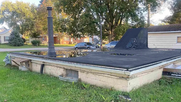 Это "подвальный дом". Просто обычный жилой дом, но изначально построенный как подвал, в земле. После второй мировой в США началось сильное развитие пригорода, и возникла проблема с жильем. Такие дома считались доступными по цене, легкости создания, теплу. Типа стены не надо сложные делать, ямку выкопал, бетоном залил, тонкие стенки поставил и живи себе. Разбогател? Ставь этаж сверху. Лестница, конечно, сразу вела вниз, в подвалодом. Они считались подходящими для ветеранов и молодежи. Сейчас почти все уже достроены, но некоторые нет, вот как на картинках. Затапливало? Да, бывало. Ну вы же "Паразитов" смотрели? Там так же топило.